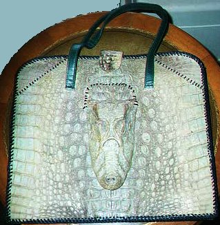 Leather Repairs. This interesting item was brought to me by an antique dealer who found me at one of the many craft shows I attend. All lacing was destroyed and only usable items were alligator hide, cowhide lining, and clasp. Entire item was hand relaced with calf lacing and provided straps were reattached. This was snatched from the "throw-out" pile and restored to better than new condition. For less than $100 in repairs, this item is now reported to be valued at well over $1000! |